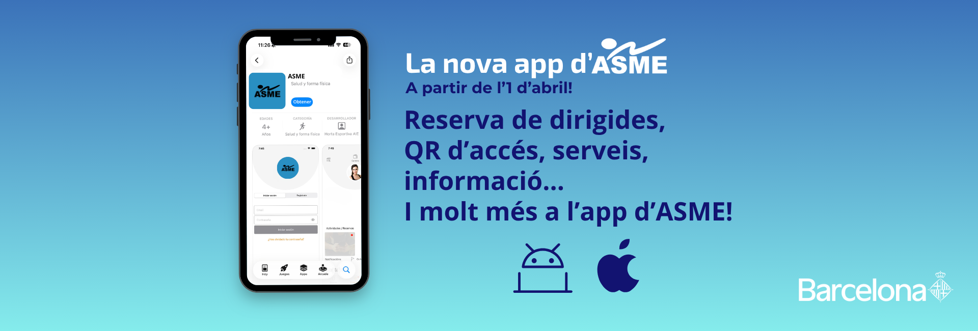 A partir de l’1 d’abril entra en funcionament la nova app d’ASME. A partir d’aquesta data, es centralitzaran en un únic espai totes les funcionalitats vinculades a l’activitat esportiva i als serveis dels centres.