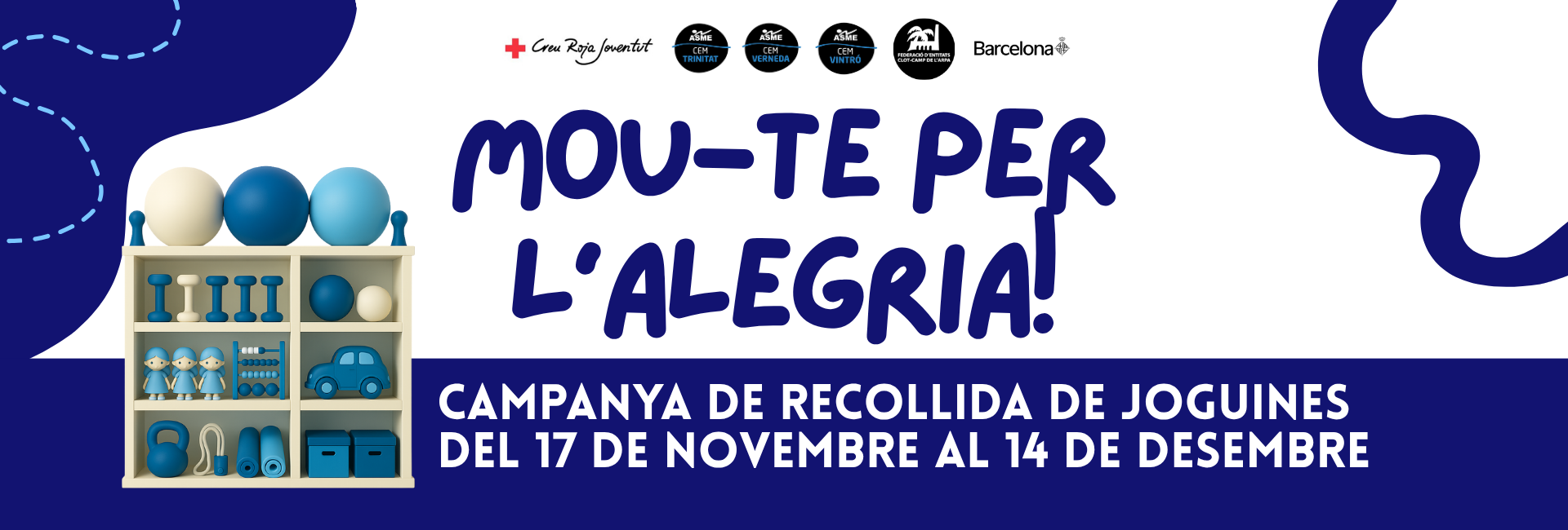 Als centres CEM La Verneda i CEM Trinitat Vella col·laborem amb Creu Roja Joventut per a la seva campanya anual i al centre CEM Vintró col·laborem amb la Federació d’Entitats Clot‑Camp de l’Arpa per a la seva 36a campanya. Ambdues campanyes de recollida de joguines seran a partir del 17 de novembre i es prolongaran fins al 14 de desembre.