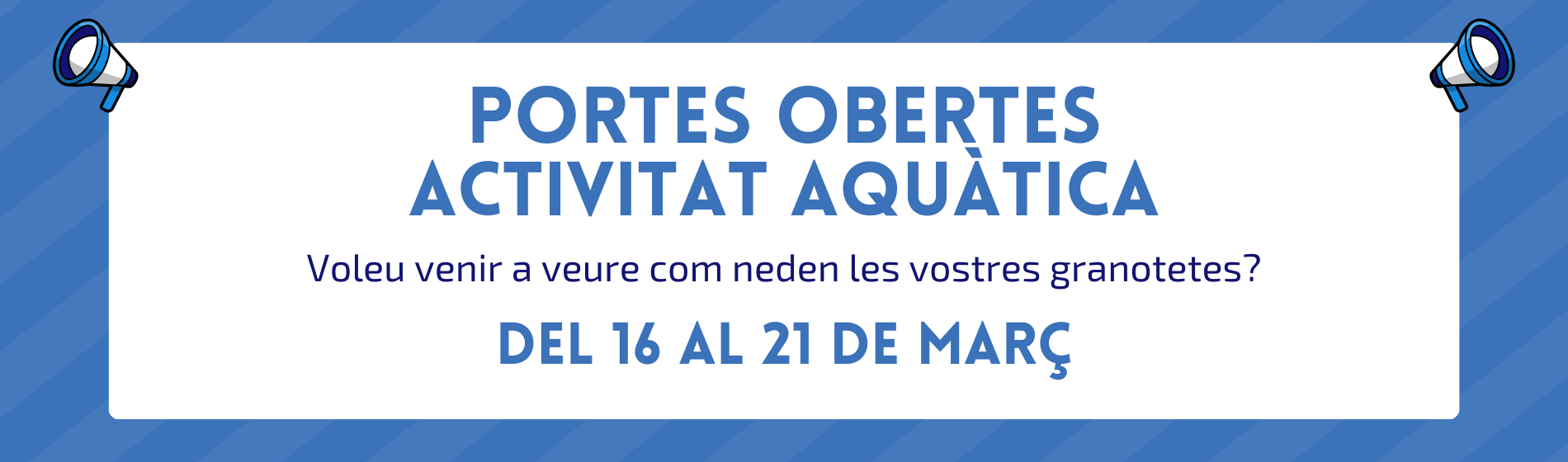 Del 16 al 21 de març, les famílies dels infants i nadons inscrits als cursets d’activitat aquàtica podreu gaudir de la Setmana de Portes Obertes als nostres centres. Durant aquests dies, podreu veure en directe els progressos dels més petits i petites dins de l’aigua. Aquestes portes obertes es fan coincidint amb el final del segon trimestre del curs 2025-2026.